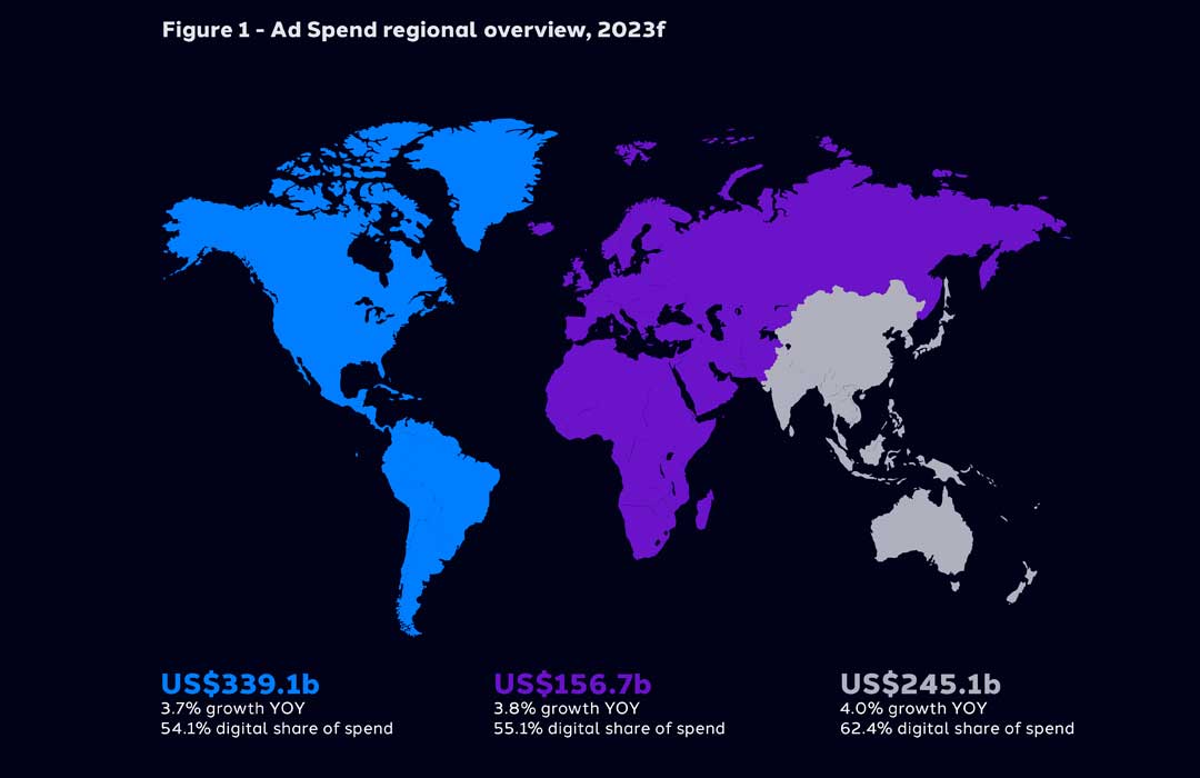 Las perspectivas de la publicidad mundial en 2023, según el último informe de dentsu “Global Ad Spend Forecasts”, son positivas. Se espera un crecimiento del 3,8%, tras analizar 58 mercados en todo el mundo, con una inversión esperada de 740.900 millones de dólares.